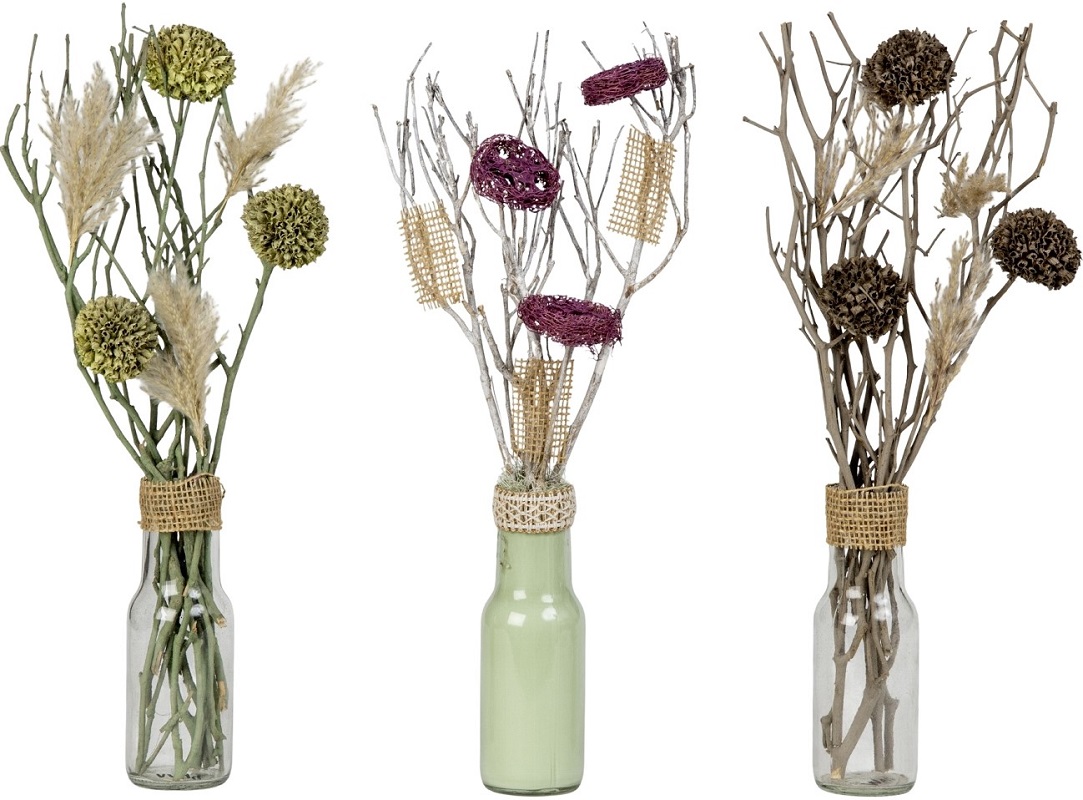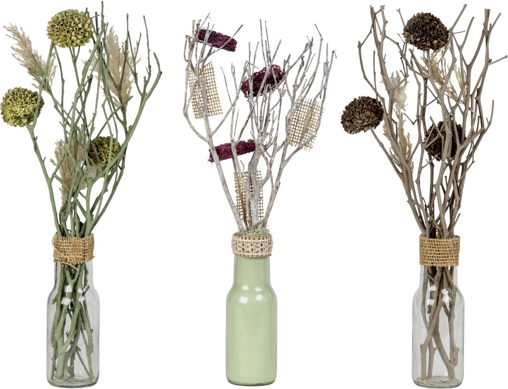 Trockenblumen-Gesteck im Glas mit Grünen-, Lila- & Braunen Blumen 3/s ca. 38cm