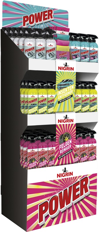 Nigrin POWER -2- Verkaufsaufsteller 100tlg. - Bodendisplay bestückt mit: 16x POWER Mikrofaser-Tücher-Set, 30x POWER Felgen-Reiniger 750ml, 30x POWER Insekten-Entferner 750ml, 12x POWER Scheiben-Reiniger 750ml, 12x POWER Innenraumreiniger 750ml