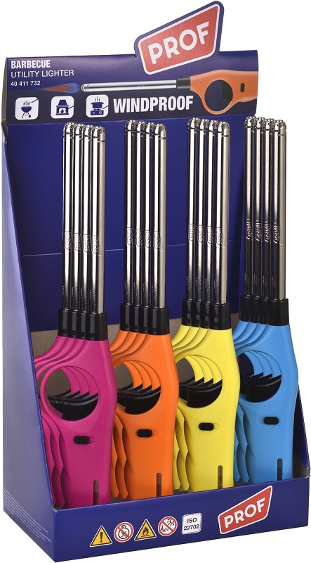 Stabfzg./Kerzenanzünder Sturmflamme Bunt sort., nachfüllbar, Windproof-Flamme, mit Füllmengenanzeige 4/s ca. 27cm (Pink, Orange, Gelb, Blau) im 16er T-Dsp.
