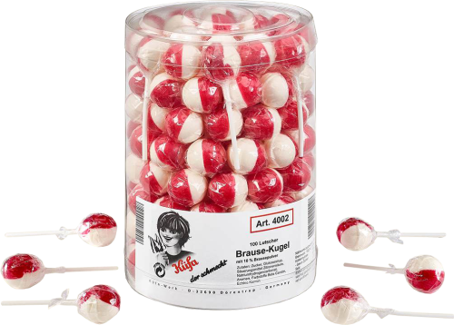 Küfa Brause-Kugel Lollis mit Kirsch-Geschmack und einem Kern aus Brausepulver in 100er Dose
