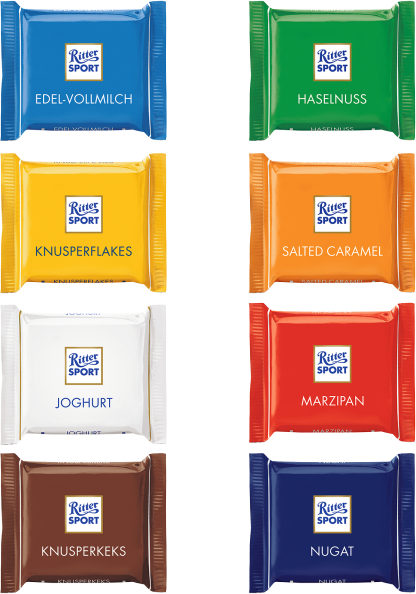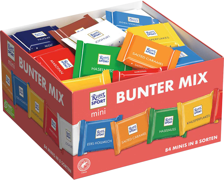 Ritter Sport Mini Bunter Mix 8/s 1,4kg im 84er T-Dsp. (Haselnuss, Marzipan, Nugat, Vollmilch, Joghurt, Knusperflakes, Knusperkeks, Salted Caramel)