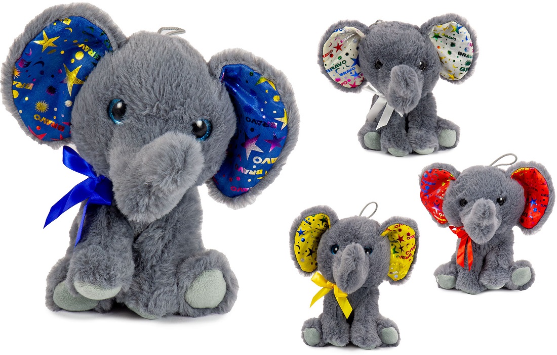 Plüsch Elefant sitzend mit bunten/glitzernden Ohren & Schleife ca. 18cm 4/s (Blau, Weiß, Gelb, Rot)
