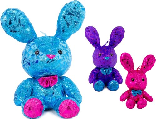 Plüsch Hase sitzend aus glänzendem Stoff mit GlitzerAugen & Schleife 3/s ca. 35cm (Pink, Lila, Blau)