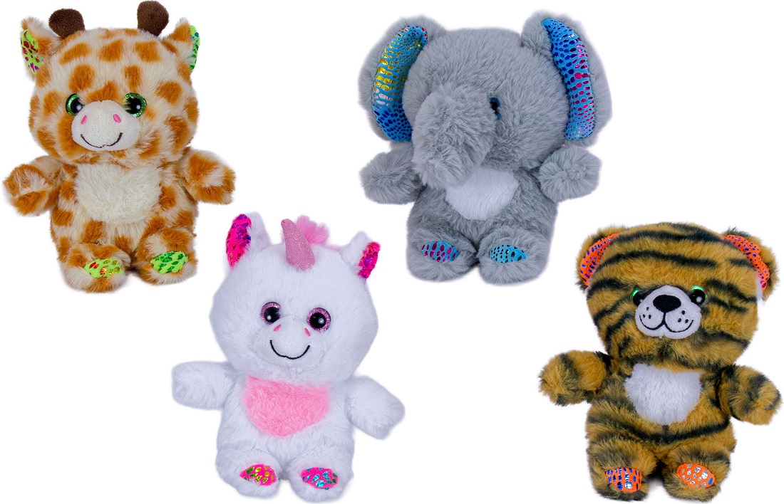 Plüsch Tiersortiment mit GlitzerAugen & GlitzerOhren/-Pfoten 4/s ca. 16cm (Giraffe, Elefant, Einhorn, Tiger)