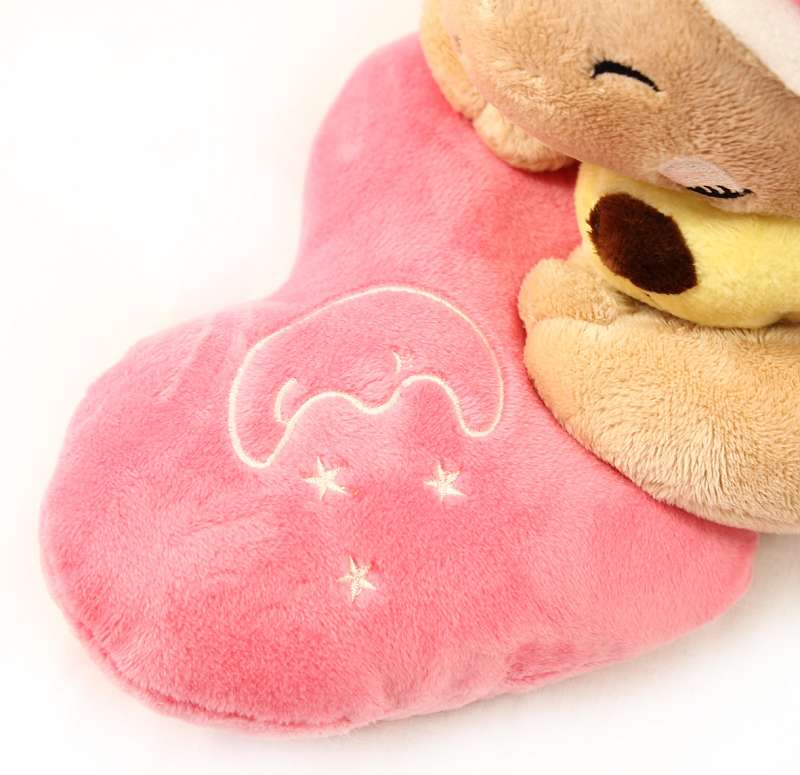 Schlafbär auf Herzkissen mit Mütze, liegend ca. 40cm, 2-fach sort.