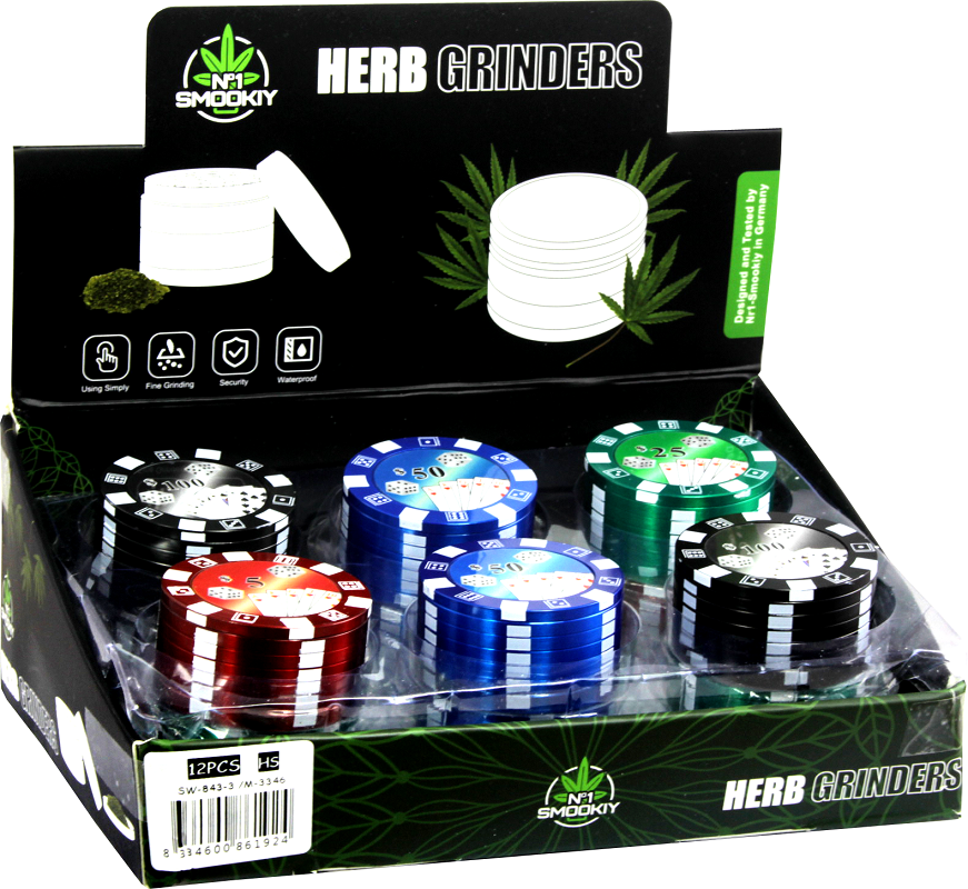 Grinder Metall im Pokerchip Design Ø50mm 3-tlg. im 12er T-Dsp.