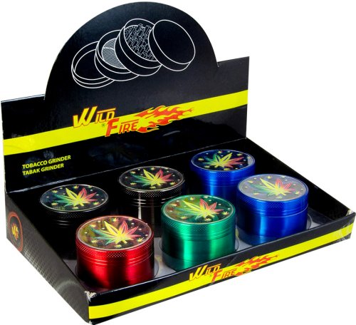 Metall Grinder WINDOW RASTA LEAF CNC Aluminium ca. Ø 50mm 4tlg. in 6er T-Dsp.(Blau, Schwarz, Grün, Rot)