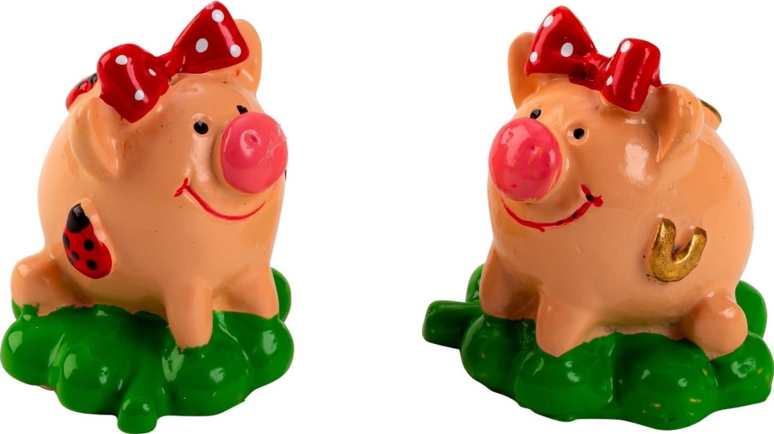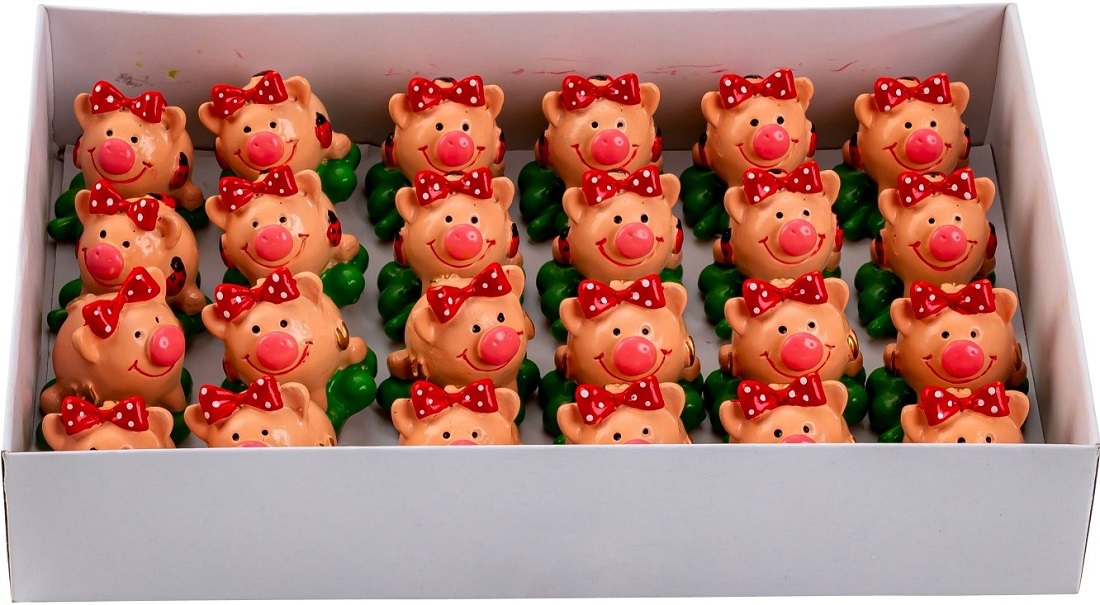 Glücksschweinchen auf Kleeblatt mit Schleife ca. 3,5 x 2,5cm 2/s im 24er T-Dsp. (Hufeisen, Marienkäfer)