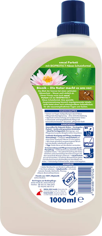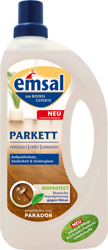 Emsal Bodenpflege Parkett in 1000ml Flasche - versiegelt, geölt, gewachst - für alle Arten von Dielen-, Holz- & Parkettböden, mit Aufquellschutz für wasserempfindliche Fugen und Kanten