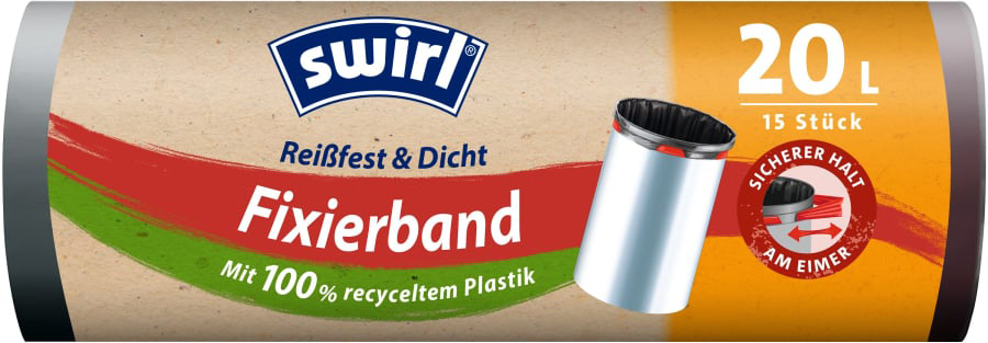 Swirl Müllbeutel mit Fixierband, extra verstärkte, reißfeste & dichte Abfallbeutel, 15 Stk. á 20L