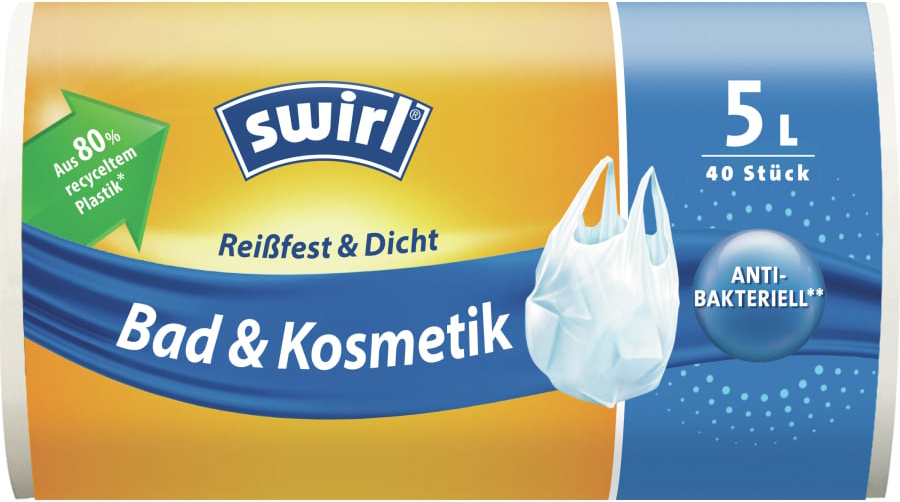 Swirl Müllbeutel mit Tragegriff, besonders reißfest & antibakteriell, für Bad & Kosmetik, 40 Stk. á 5L