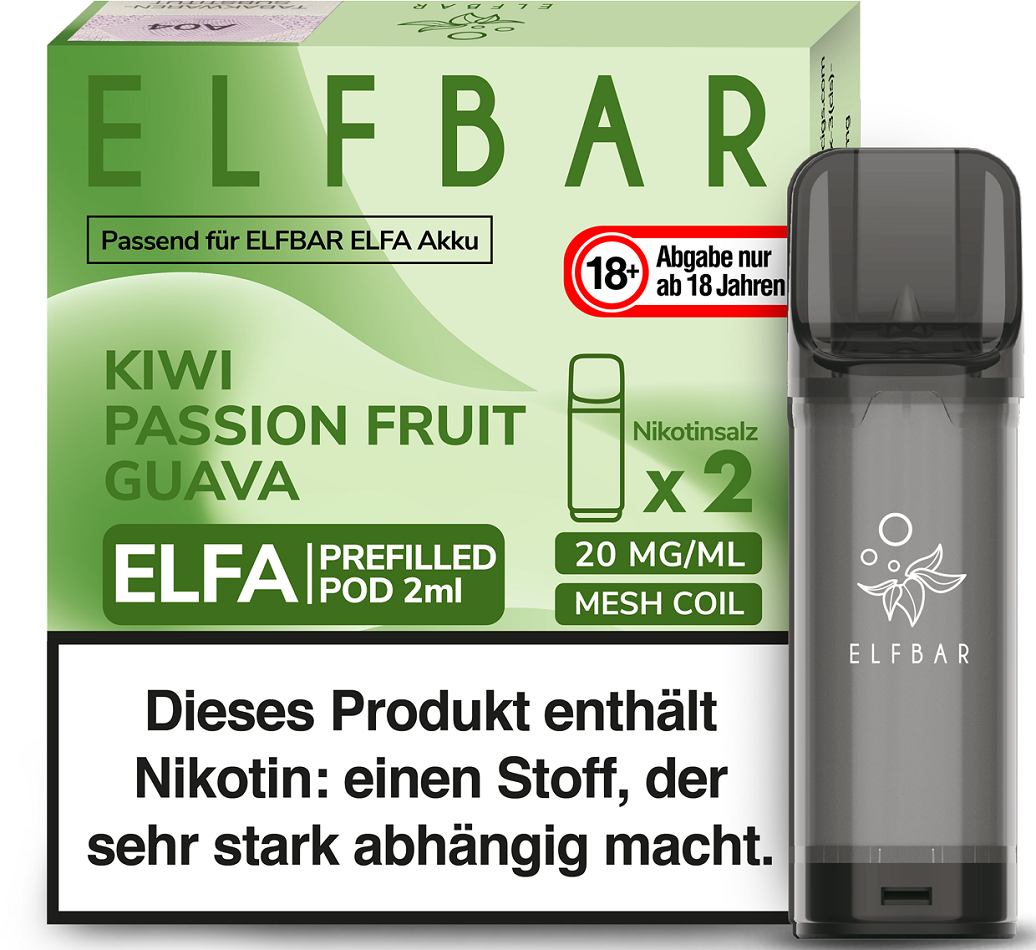 Elfbar ELFA CP Prefilled Pod KIWI PASSIONFRUIT GUAVA ca. 600 Züge - Nikotin 2ml Liquid Nikotin 20mg/ml Prefilled-Pod System TPD konform 2er Pack in 10er T-Dsp.(kompatibel mit allen ELFA Basisgeräten)(mit Steuerbanderole)