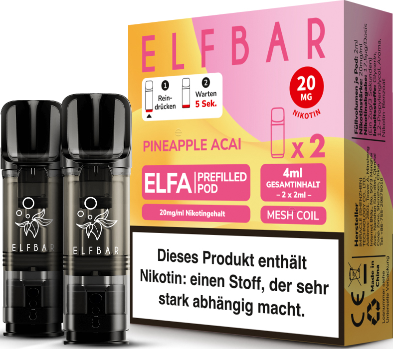 Elfbar ELFA CP Prefilled Pod PINEAPPLE ACAI ca. 600 Züge - Nikotin 2ml Liquid Nikotin 20mg/ml Prefilled-Pod System TPD konform 2er Pack in 10er T-Dsp.(kompatibel mit allen ELFA Basisgeräten)(mit Steuerbanderole)