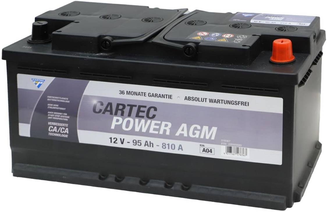 CARTEC POWER AGM Starterbatterie 95 AH / 810 A (KSN A04) - Wartungsfrei, geeignet für moderne Fahrzeuge mit Start-Stopp-Systemen (mit & ohne Rekuperation), sehr hohe Zyklenfestigkeit & verbesserte Ladeeffizienz, Auslaufsicher & bis zu 45° verbaubar, verbesserte Kaltstartfähigkeit, fortschrittlichste Betterietechnologie auf dem Markt (Kaltstartstrom 810A, verlängerte Lebensdauer + 36 Monate Garantie)